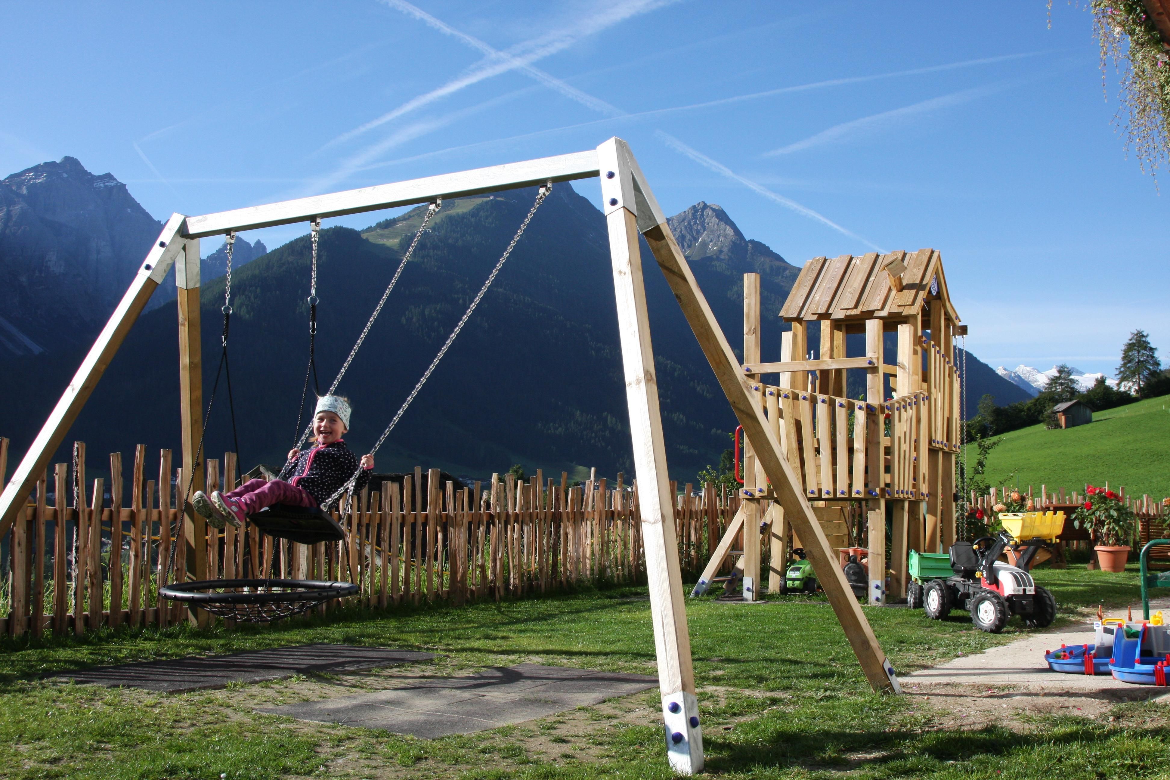 Naturalmente non può mancare un grande parco giochi che offre tutto ciò che il cuore di un bambino desidera. Qui i bambini possono davvero sfogarsi. Nel frattempo, mamma e papà possono godersi l'acqua della sorgente della nostra fattoria o un buon bicchiere di vino, sempre con la vista del nostro panorama montano mozzafiato.