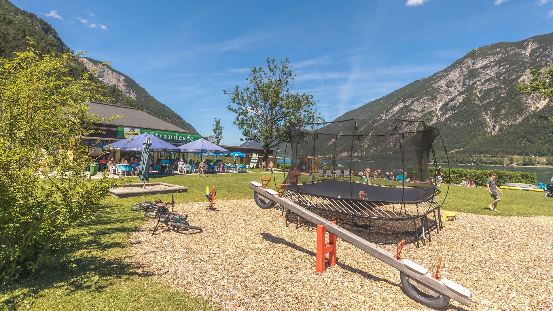 A pochi metri dal centro città, il lido di Pertisau offre un ampio prato per prendere il sole, un parco giochi, una piattaforma per i tuffi, uno snack bar e il noleggio di SUP: l'ideale per una giornata di nuoto attivo!